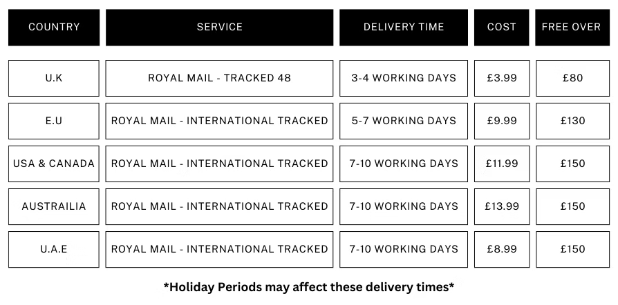 * All ORDERS PLACED BETWEEN 15TH NOV 2025 & 24TH DEC 2025 WILL BE ELIGIBLE FOR A RETURN UP UNTIL 5TH JANUARY 2026 TO ALLOW FOR CHRISTMAS GIFTS *